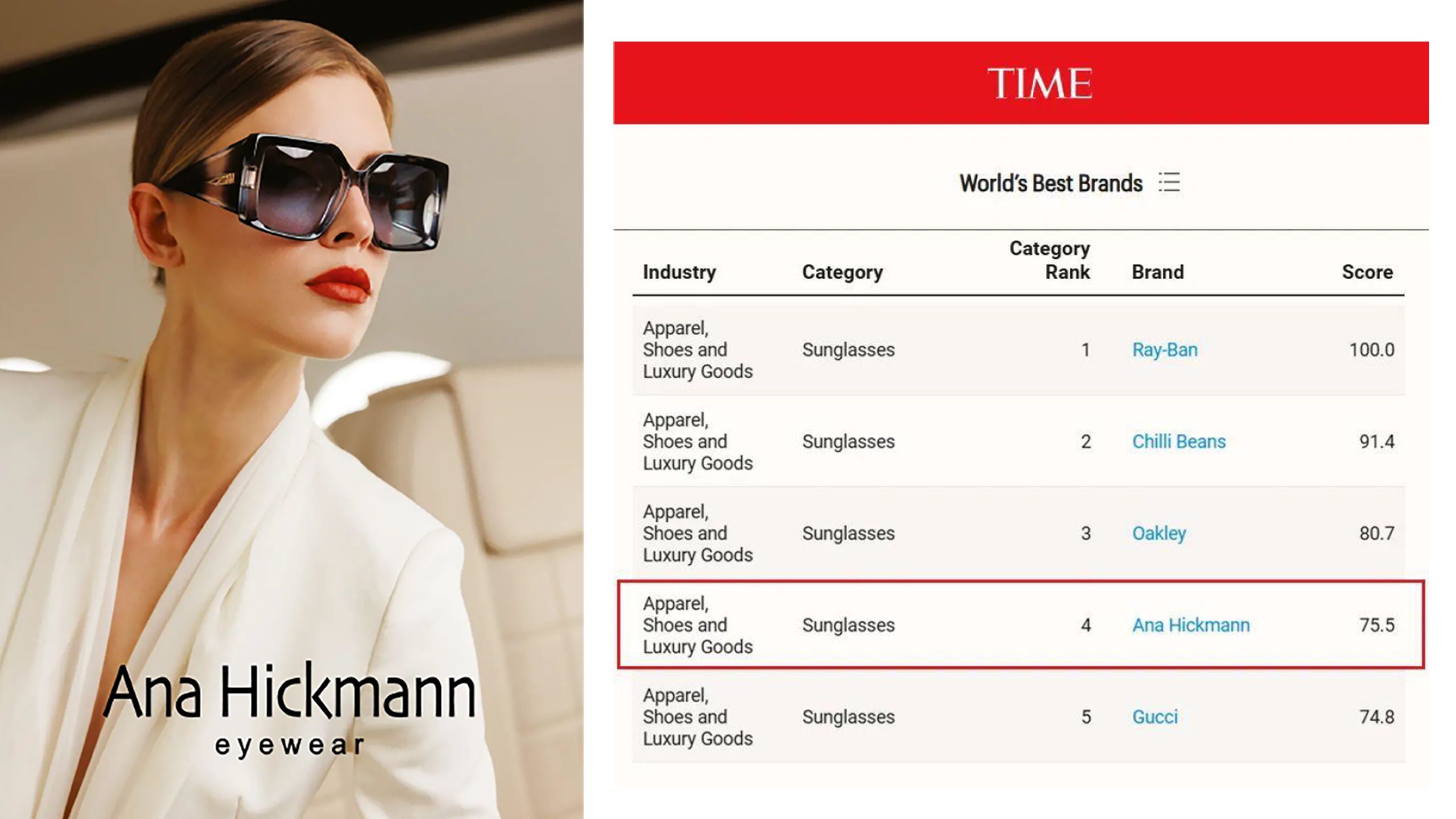 Ana Hickmann 位列「太陽眼鏡(Sunglasses)」品類第 4 名,也是前五名中唯一的女性眼鏡品牌;與 Ray-Ban、Chilli Beans、Oakley、Gucci 同上榜。